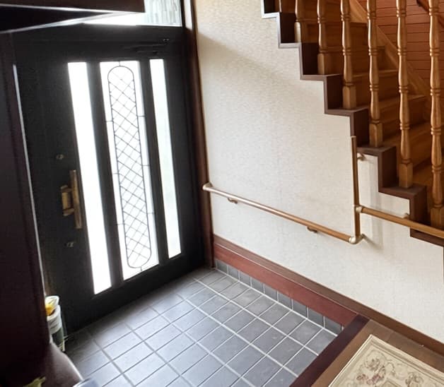 横浜の工務店によるより安全で安心の住み心地を目指した住宅のリノベーション:木製階段と収納のある玄関